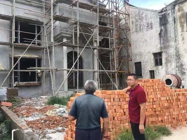 $ ?( H) C6 k& d; F6 F西郊村工作人员巡查村里施工现场,督促做好防台工作