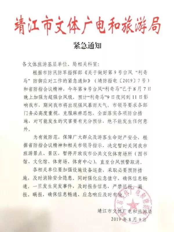 靖江市文体广电和旅游局:为有效防范,保障广大群众及游客生命财产安全,决定暂时关闭我市旅游景区(牧城公园、人民公园、岳庙·刘国钧故居),暂停开放我市公共文化体育场所(图书馆、文化馆、体育场、体育中心),直至台风预警解除。 靖江蓝天救援队:开启24小时备勤机制,市民台风期间遇紧急情况可拨打24小时免费救援电话: $ H8 {4 L7 _; f! r: V. U