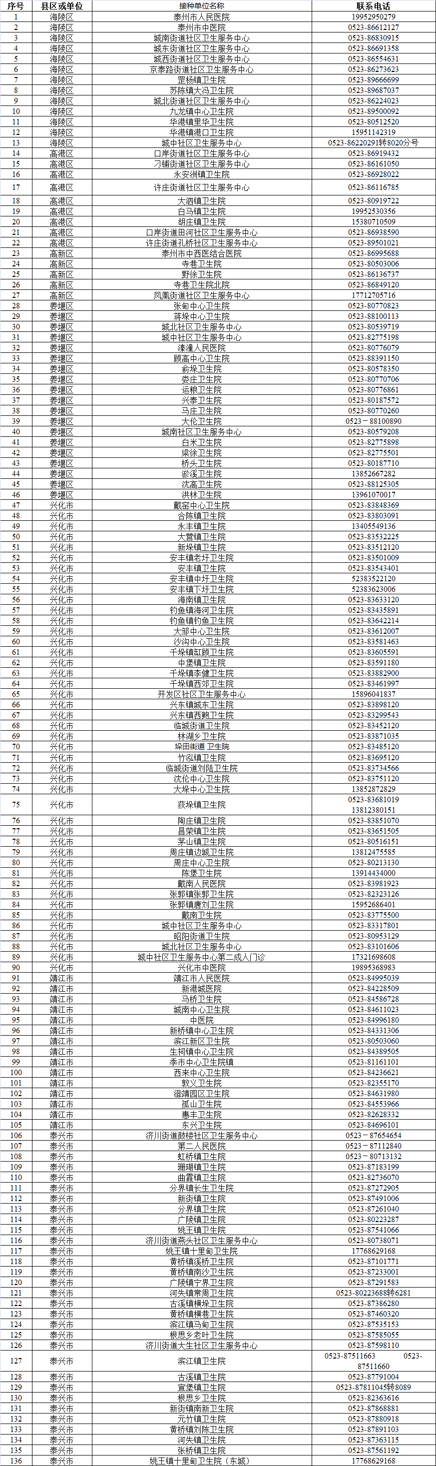 + }5 i2 D5 Z# C8 c, @5 ~3 e$ L" w新冠疫苗接种门诊信息 (点击图片可放大) 另外泰州市吸入用 新冠病毒疫苗接种门诊 (需提前电话预约) (具体服务时间以接种单位公示为准) : l1 B3 c, O/ p8 `% R. X