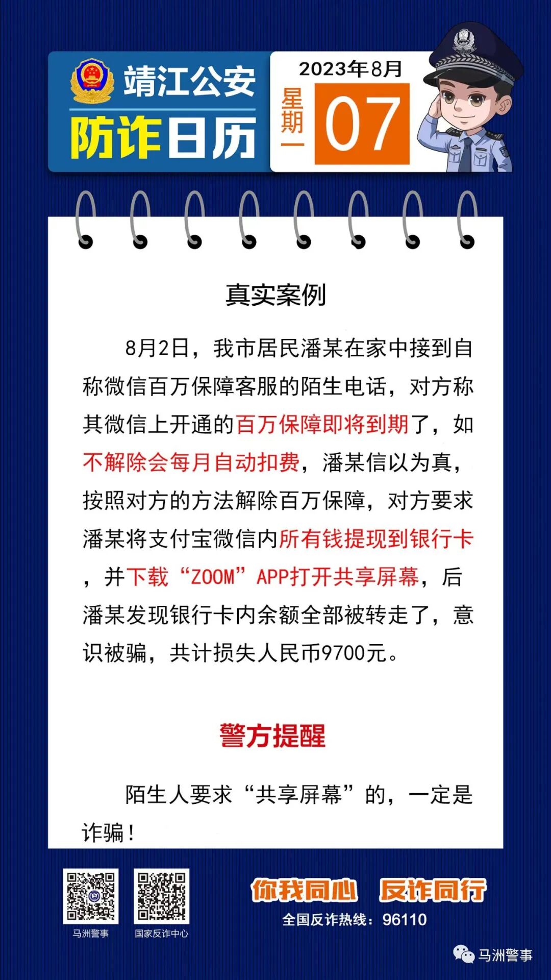 7月29日,顾女士接到自称是微信百万保障客服的电话,称其在微信上开通了“百万保障”,如不关闭则需办理退订手续,引导顾女士下载了“zoom”App,进入APP顾女士按对方要求开启共享功能退订“百万保障”,对方以保护账户安全为由,诱骗顾女士通过手机银行向对方提供的“安全账户”转账,后发现被骗,共计损失人民币3200元。 @【警方提醒】
