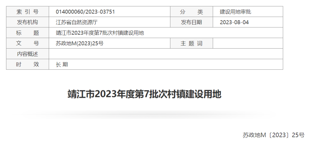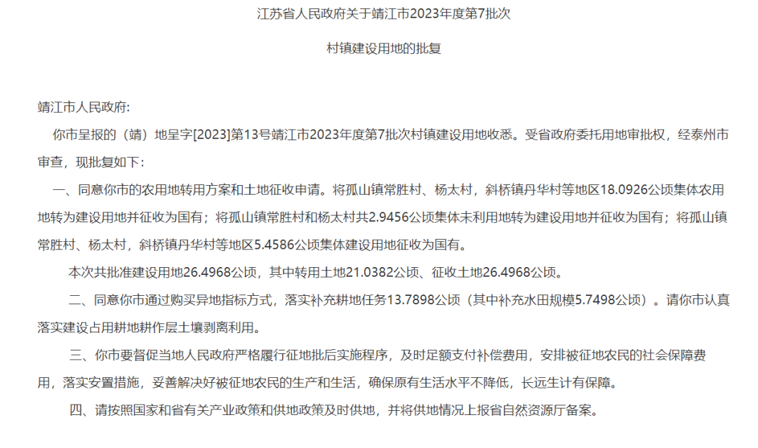 6 x3 ]' R/ ? k8 \( T近日 江苏省自然资源厅网站发布了 省政 府关于 靖江部分村镇建设用地的批复 此次主要涉及靖江两个镇三个村 共26.4968公顷(约397.5亩)土地 . a2 d- B6 X" a) \8 x. ~2 e