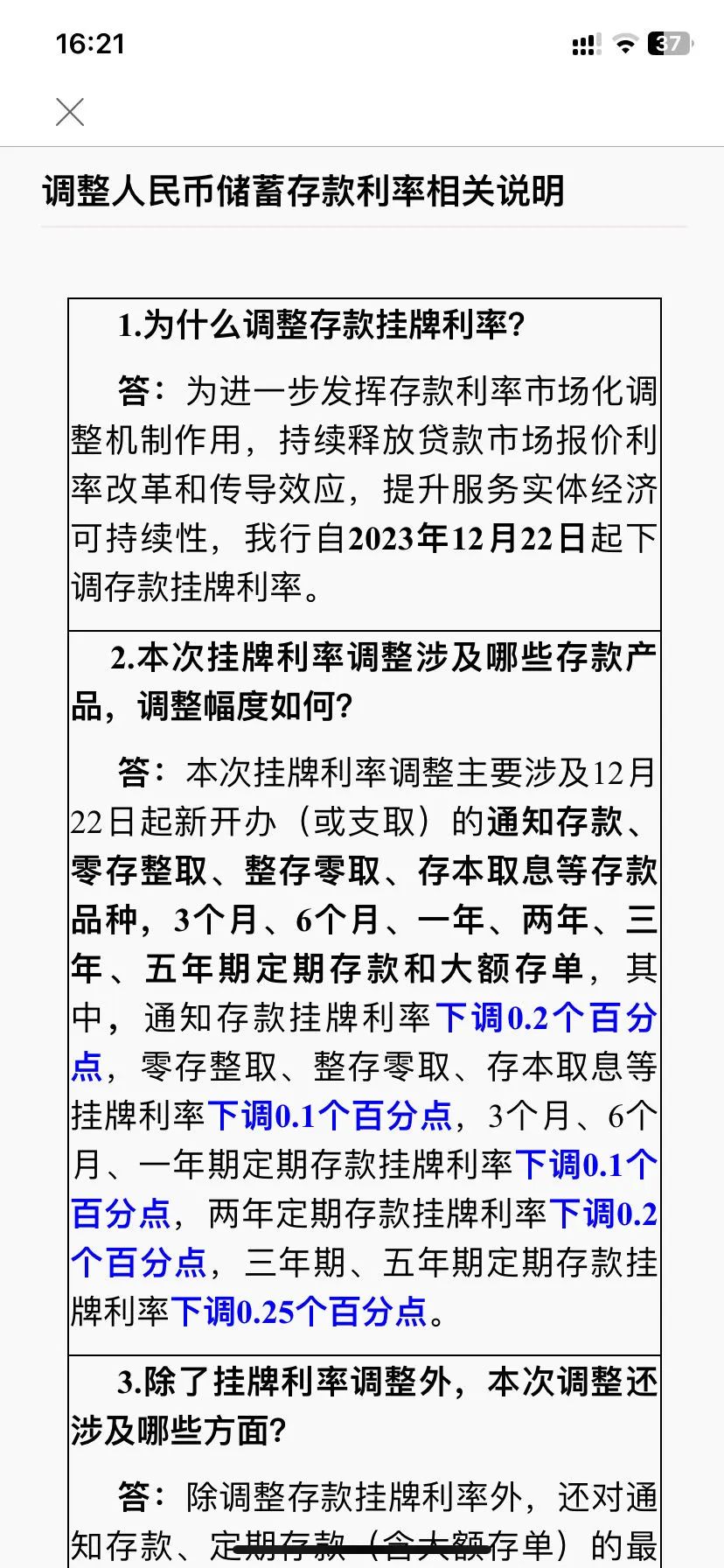 12月21日,工商银行在其App上发布《调整人民币储蓄存款利率相关说明》称,为进一步发挥存款利率市场化调整机制作用,持续释放贷款市场报价利率改革和传导效应,提升服务实体经济可持续性,该行自2023年12月22日起下调存款挂牌利率。