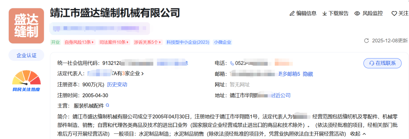 据公开资料显示:靖江市盛达缝制机械有限公司成立于2005年,注册资本900万元,目前涉及自身风险13条,司法解析10条,涉诉关系5个。