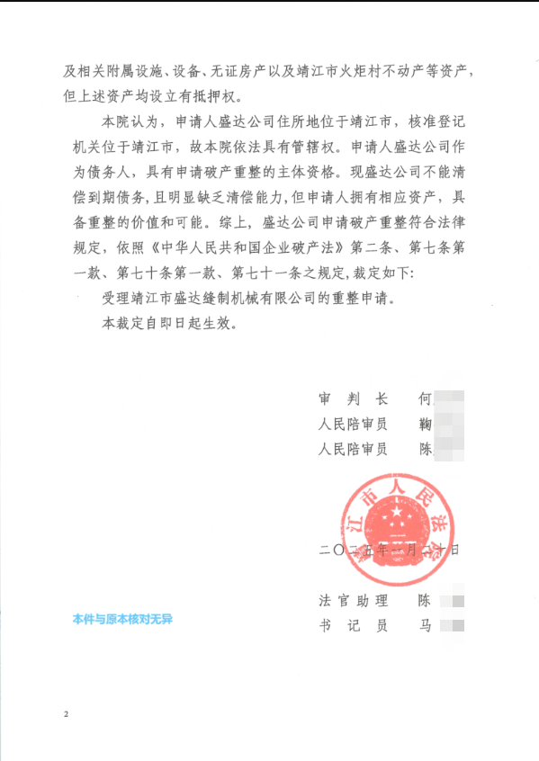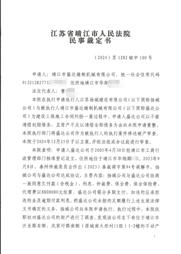已经经营了二十载的企业,名下产业为何被拍卖?据拍卖公告显示,疑该公司与江苏扬城建设有限公司存在建设工程施工合同纠纷,盛达公司以不能清偿到期债务,且资产不足以清偿全部债务为由向法院申请重整。   据拍卖公告显示,靖江法院已于2025年1月20日裁定受理靖江市盛达缝制机械有限公司破产重整一案。 以上仅摘**卖公告部分内容,具体请登录阿里拍卖平台详细查询!