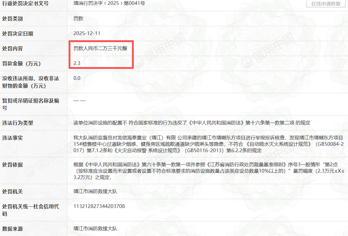 消防安全无小事!近日,靖江市消防救援大队公布一则行政处罚信息,靖江一房企所承建项目因消防设施配置不符合国家标准,被依法处以2.3万元罚款,为所有企业敲响了消防安全的警钟。 据公开处罚信息显示,靖江市消防救援大队消防监督员对龙信海泰置业(靖江)有限公司承建的靖江市靖樾东方项目进行举报投诉核查,发现靖江市靖樾东方项目 15[color=#576b95 !important][url=]#楼售楼中心过道缺少烟感[/url]、健身房区域疏散通道缺少喷淋头等隐患,不符合 《自动喷水灭火系统设计规范》(GB50084-2017)第7.1.2条和《火灾自动报警系统设计规范》(GB50116-2013)第6.2.2条的规定。