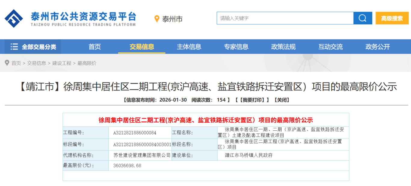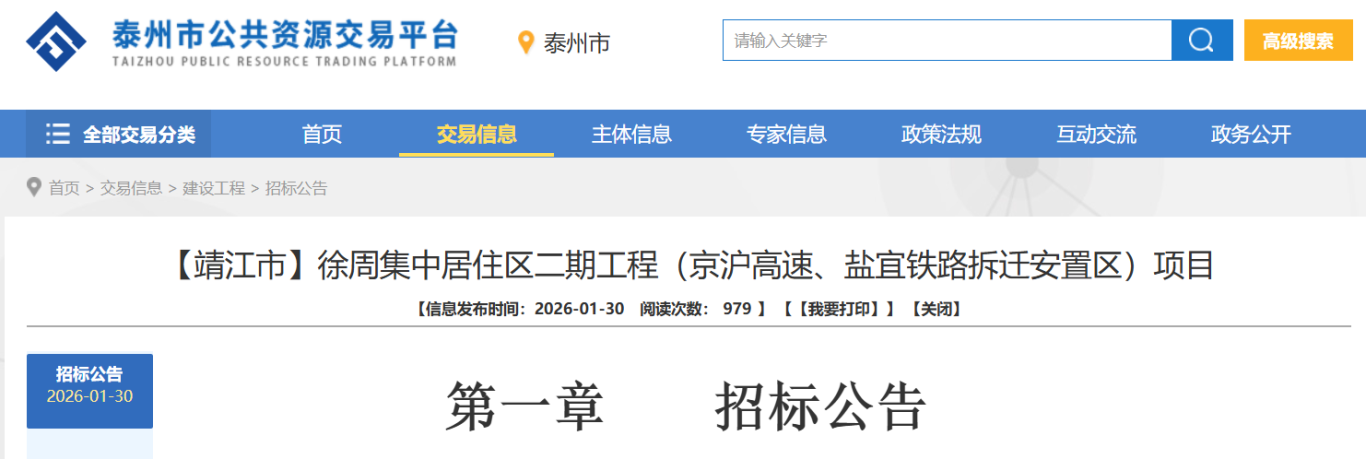 安置区项目 是牵动群众利益的大事 好消息! 靖江徐周集中居住区 二期工程最新进展来了 项目主要涉及 京沪高速、盐宜铁路拆迁安置 ▼▼▼ 近日,泰州市公共资源交易平台发布《徐周集中居住区二期工程(京沪高速、盐宜铁路拆迁安置区)项目》招标公告,标志着该项目即将启动建设。
