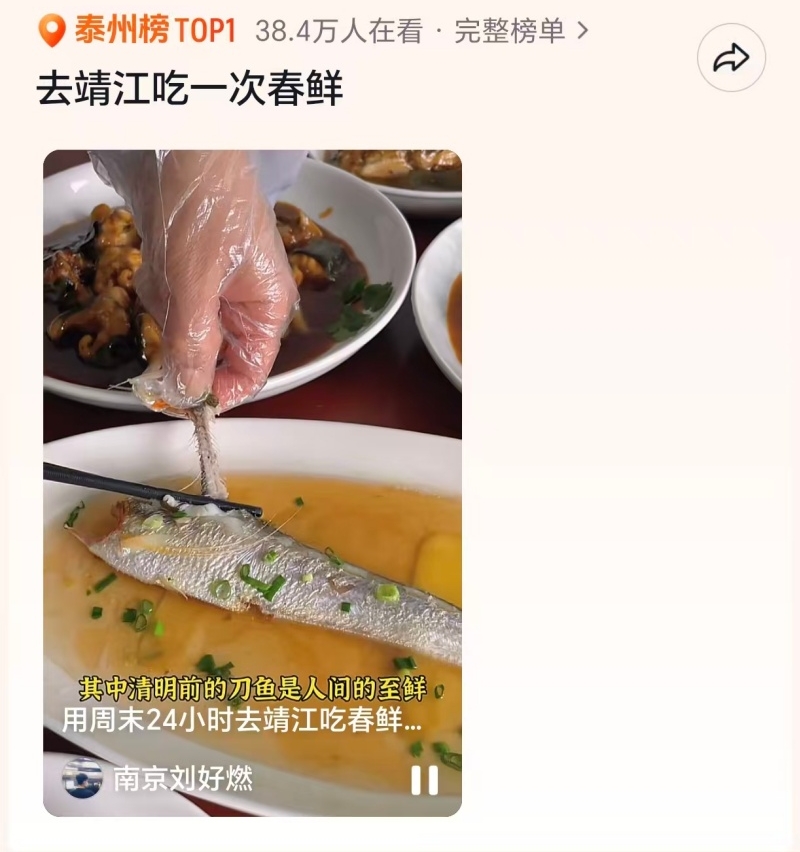 最近,靖江又火出圈了,一段“24小时吃遍靖江春鲜”的视频刷屏全网。百万粉丝博主“南京刘好燃”专门抽了个周末来到靖江,一路寻访靖江的春日鲜味,短短一条视频,收获全网数万点赞、转发,靖江美食美景再次实力“出圈”! “去靖江吃一次春鲜”登上了泰州热搜榜第一。