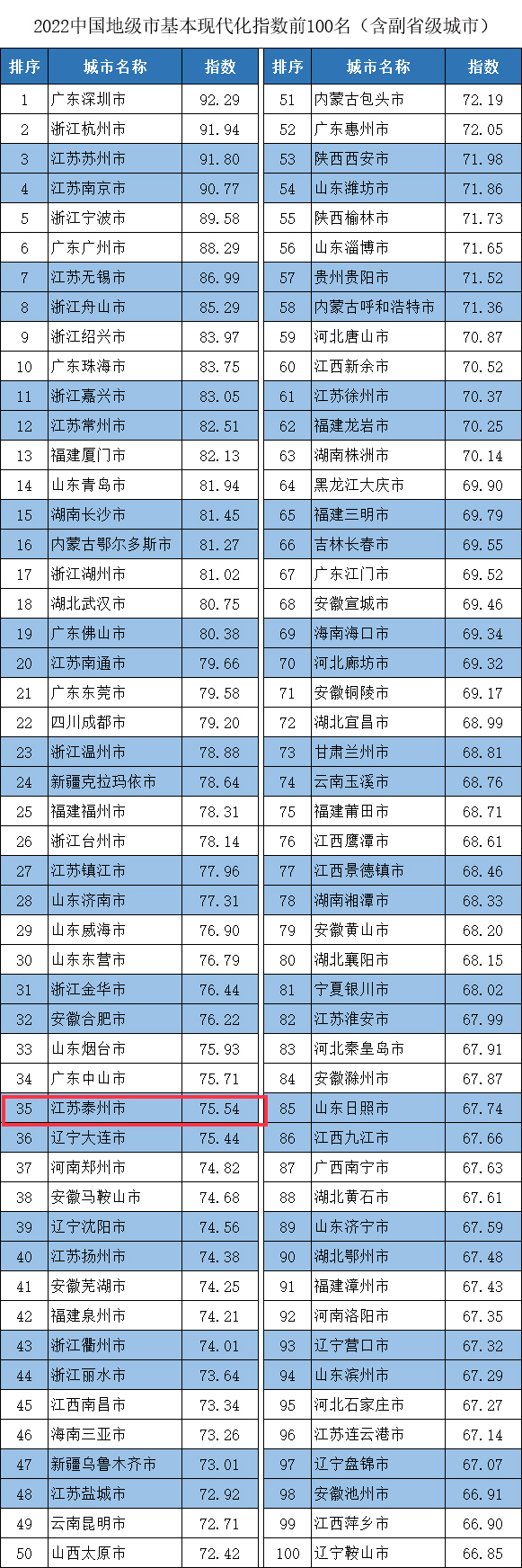 2022中国地级市基本现代化指数前100名
