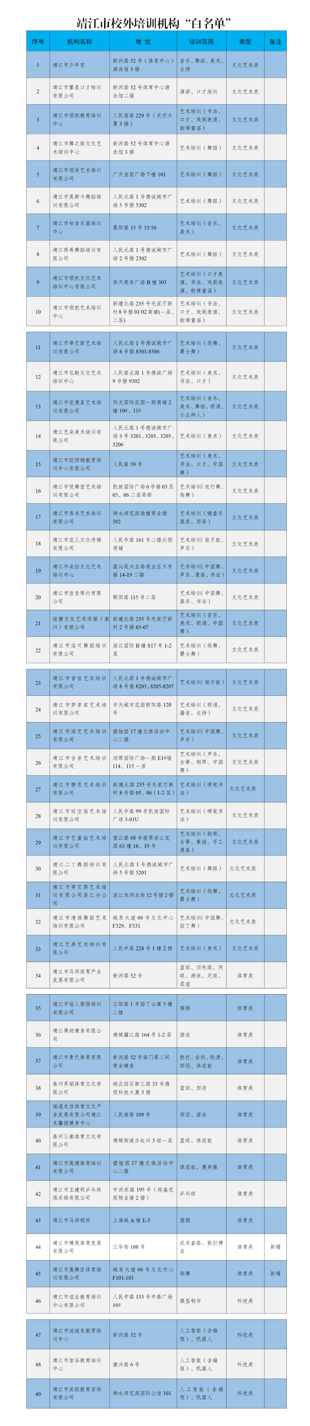 明确培训需求。如确有参加非学科类培训的需求,请家长朋友们务必与孩子充分沟通,尊重其兴趣意愿,理性评估实际需要,切勿盲目报班加重负担。 核实机构资质。要选择“证照齐全”的培训机构(白名单附后),即具备行业主管部门核发的《非学科类校外培训机构审核意见书》,市场监管部门(民政部门)核发的营业执照(民办非企业单位登记证书)。 签订规范合同。报名前务必与机构规范签订服务合同,逐条仔细阅读合同条款,明确培训项目、内容、时间、师资、收费、退费办法及双方权责等关键信息。 警惕缴费陷阱。不早于培训开始前1个月缴费、不一次性缴纳超过3个月或60课时的费用,且总额不超过5000元,并索要正规收据和发票。费用务必缴入机构预收费资金监管专用账户,拒绝任何私下交易、现金交易。 **隐形变异学科培训。自觉**以“托管”“家教”“研学”“夏令营”“思维素养”等各种名义违规开展的学科类培训,避免权益受损。参与违规培训不仅无法保障培训质量,还可能存在安全隐患,损害您和孩子的合法权益。