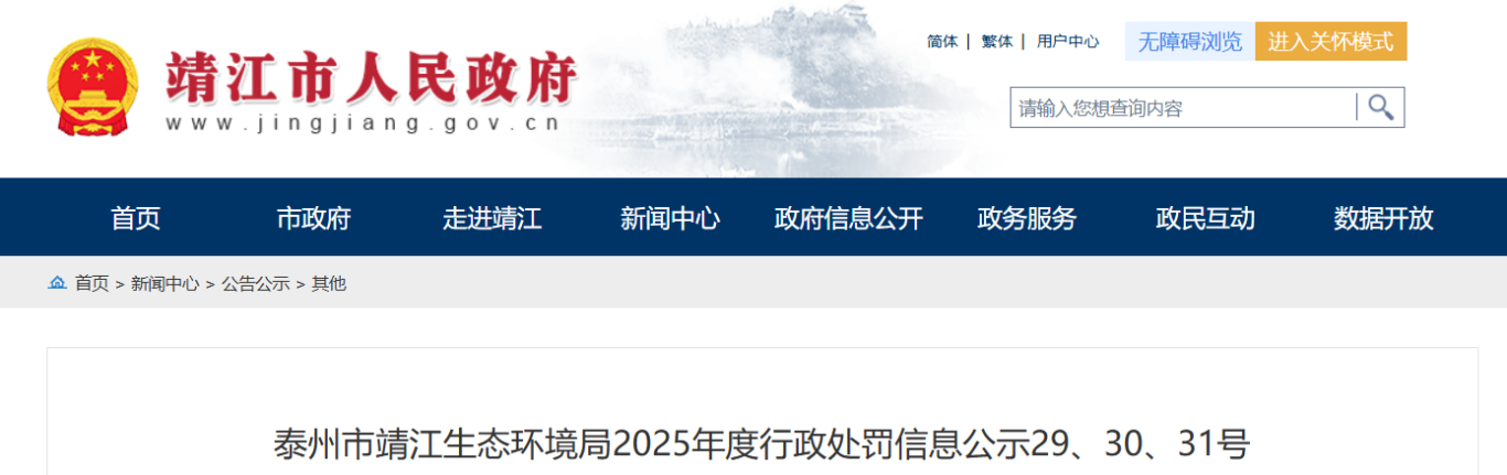 5 ~4 G% f6 t" Q 行政处罚决定书文号:泰〔靖〕环罚字〔2025〕31号 违法行为类型:违反了《排污许可管理条例》第十八条第二款的规定。 违法事实:靖江太和港务有限公司厂区西北侧围墙边设置了一个通向污水管网的排污口,与该公司排污许可证表19废水类别、污染物及污染治理设施信息表中规定的排污口数量、排放去向不相符。 处罚依据:依照《排污许可管理条例》第三十六条第一项的规定,按照《长江三角洲区域生态环境行政处罚裁量规则》:表3-2 裁量表的规定。 处罚类别:罚款 处罚内容:罚款,责令立即改正污染物排放口数量、排放去向与排污许可证规定不相符的违法行为。 罚款金额(万元):2 处罚机关:泰州市生态环境局 6 Z6 U, t9 p% Z2 x+ {# C K
