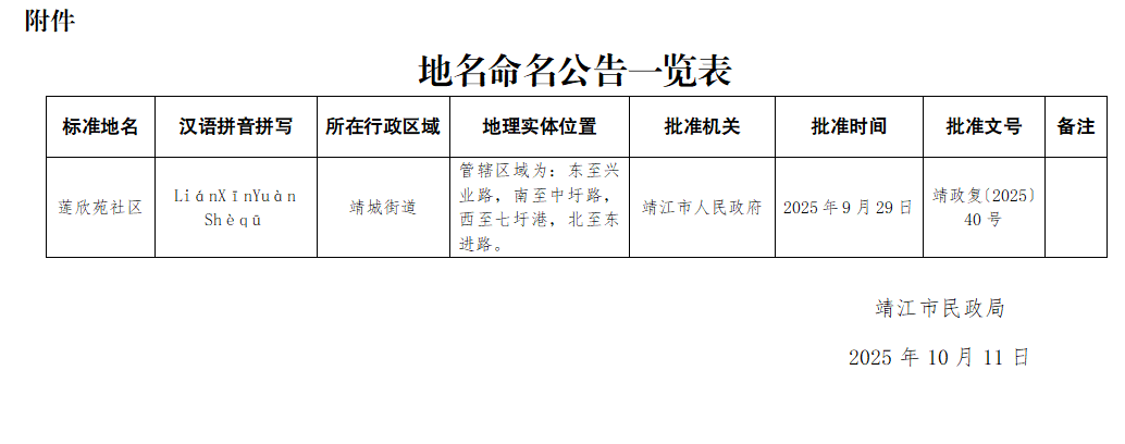 根据国务院《地名管理条例》规定,莲欣苑社区地名命名已由靖江市人民**批准,现予以公告。